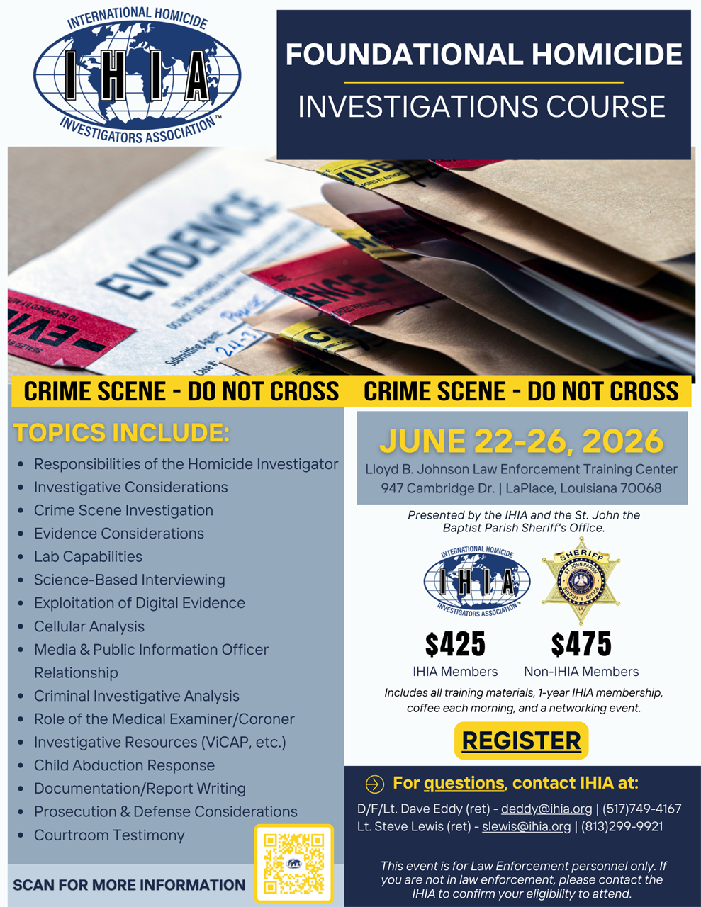The IHIA and the St. John the Baptist Parish Sheriff's Office will be presenting the Foundational Homicide Investigation Course in LaPlace, Louisiana from June 22-26, 2026