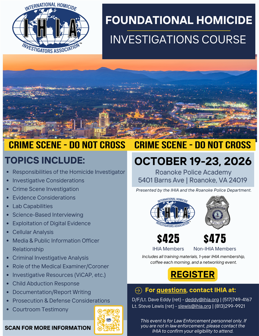 The IHIA and the Roanoke Police Department will be presenting the Foundational Homicide Investigation Course in Roanoke, Virginia from October 19-23, 2026